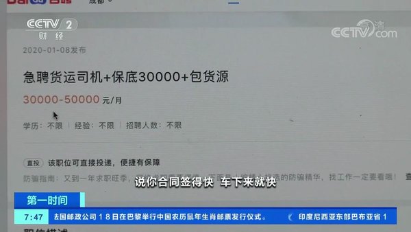 关于“货运司机招聘套路”此前1月份中央2台就对此现象进行过曝光,大多数假运输公司,假借高薪招聘的名义,用高收入吸引应聘者买车,实则是假招聘真套路的吸引着一批批人陷入套路之中。而且中,大部分人员由于缺乏货运行业从业经验,尤其容易中招。